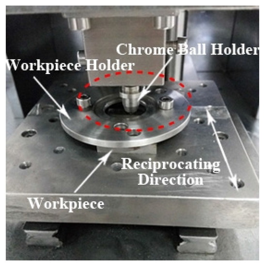 The nylon cage was utilized to hold the ball and avoid the vibration and noise. An external load of 10 N was applied along the axis direction of the cylinder pressing on the aforementioned ball in the sliding test. The stroke of the table was set as 5 mm and the spindle rotation was 800 r/min. Meanwhile, the friction frequency and amplitude were recorded by an acceleration sensor (JHK-ZHJ-3) (Beijing Centrwin Technology. Co., Ltd. Beijing, China.) together with the data acquisition instrument (RP-3500) (Rigol Technologies INC, Suzhou, China). The samples with various surface roughness parameters were tested to obtain the friction coefficient, the friction frequency, the friction amplitude, the wear width, the wear depth, the weight and the volume loss, the friction coefficient and then to observe the material deformation in the subsurface.