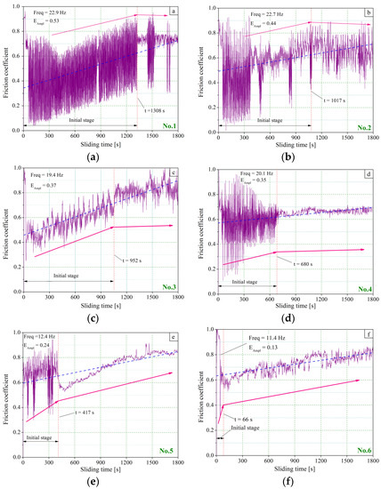 Figure 6 shows the evolution of the friction coefficients of the each sample as a function of the sliding time. One can conclude that the measured curves are characterized by the oscillations of the friction coefficients regardless of the values of amplitudes and frequencies. A similar phenomenon has been presented in the literature [39]. The vertical red dot line presents the start point of the stable friction time. As a criterion of distinguishing the initial wear from the steady wear, there is a flat tendency with a sudden reduction in amplitude occurring on the friction coefficient curves and the transition of the initial steady stage is identifiable. The friction coefficient linear fitting is also marked with a blue dashed line and a pink arrow line to denote the tendency of the friction coefficient in different stages.