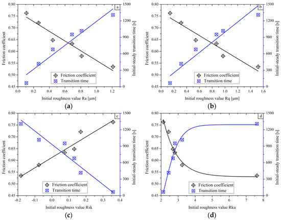 Variations of friction coefficient and initial-steady transition time with respect to initial roughness parameters: (a–d) corresponding to Ra, Rq, Rsk and Rku, respectively.