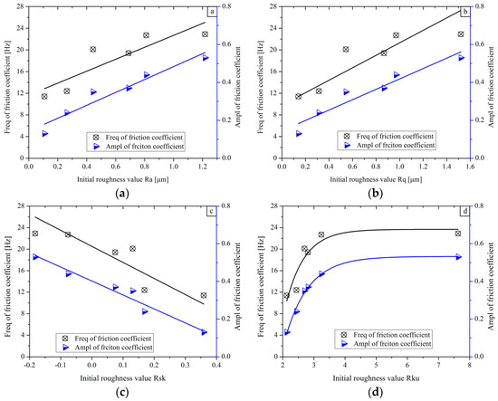 The friction parameters of Freq and EAmpl as a function of the initial roughness parameters: (a–d) corresponding to Ra, Rq, Rsk and Rku, respectively.