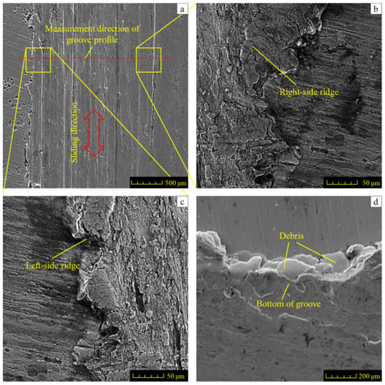 An enlarged view of the worn groove is shown in Figure 9a. The ground surface is worn out along the sliding direction and a typical wear mark with a width of about 2 mm can be clearly observed. On both sides of the worn grooves, two stripes of ridges were produced due to the plastic deformation in the sliding test, as indicated in Figure 9b,c. Such ridges could be attributed to the plastic flow. When the GCr15 ball slides against the surface, the displacement in the sliding direction causes the tangential force to induce the material plastic deformation which mainly flows in two directions, i.e., the sliding direction and the perpendicular direction to the sliding track. Along the sliding direction, the material was partly pulled up and bumped ahead of the ball, then was compressed in the groove or removed from the worn surface. Shown in Figure 9d, compressed bumps that are not removed are helpful for debris to grow in the reciprocal sliding interaction. The component force perpendicular to the sliding track is caused by the normal force, which compresses the material flow to two sides of the groove, then the ridges formed. Two-dimensional cross-sectional profiles of the groove are obtained in the middle of the track, as shown in Figure 10, and the shapes of the ridges on both sides of the worn groove are also presented. In each graph, the depth of the worn groove and the height of the ridges were measured.