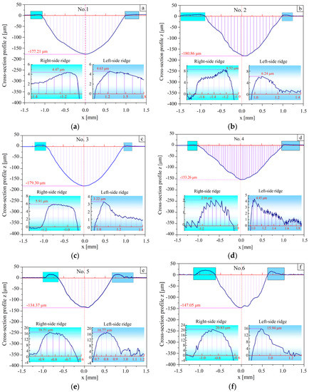 For the cross-section profile of sample No. 1 (Figure 10a), the groove has a profile with dimensions of 177.21 μm depth and 1.92 μm width. On both sides of the groove, two ridges can be observed. The height of the left-side ridge is 4.47 μm and the right-side ridge is 4.63 μm. For the profile of sample No. 2 (Figure 10b), the groove with a depth of 153.6 μm and a width of 2.08 μm appears shallower than that of sample No. 1. The height of left-side ridge is 8.52 μm and the right-side ridge is 6.64 μm. For sample No. 3 (Figure 10c), the groove profile shape has a similar geometry as aforementioned. A profile with a depth of 179.30 μm and a width of 1.64 μm was obtained. No. 4 (Figure 10d) indicates a groove profile of 153.26 μm depth and 2.02 μm width. The two ridges are of 2.16 μm and 4.45 μm depth. In Figure 10d, the ridge height (left-side, 16.51 μm and right-side, 16.77 μm) on both sides of the groove increases. The groove profile presents 134.37 μm depth and 1.31 μm width (Figure 10e). As for the sample No. 6 (Figure 10f), the depth of the worn groove is 147.05 μm. The ridge height (left-side, 20.83 μm and right-side, 15.94 μm) and groove width (1.38 μm) can also be measured after the sliding test.