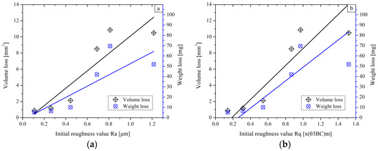 A smoother surface has a lower volume and weight loss than a rougher one. As for the friction and wear, a possible detail found in the experiment is that the loss is approximately on the same level when the initial roughness is below a certain limit (about Ra 0.3–0.5 µm, Rq 0.1–0.4 µm). These results indicate that decreasing the roughness values of Ra and Rq does not involve too much benefit in terms of improving the wear resistance when the surface roughness value is low enough.