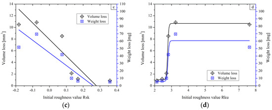 The volume and weight losses as a function of the initial roughness value: (a–d) corresponding to Ra, Rq, Rsk and Rku, respectively.