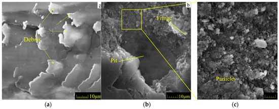 Wear debris and particles have been observed on the worn surfaces after sliding the sample with a rough surface, as shown in Figure 12a. The wear debris may be explained by the fretting wear mode occurring in a localized zone [44]. When the ball slides over the ridges between two stripes on the rough surface, oscillation with a small amplitude appears only in a localized zone between the ball and the rough surface. Then, oscillatory tangential vibrations are generated in the relative sliding motion. Such a phenomenon seems to be caused by the fretting wear process. Fretting wear induces damage to pits in which powder particles are usually filled, as shown in Figure 12b,c. Furthermore, wear fringes, grooves as well as surface micro-cracks are produced in the localized zone.