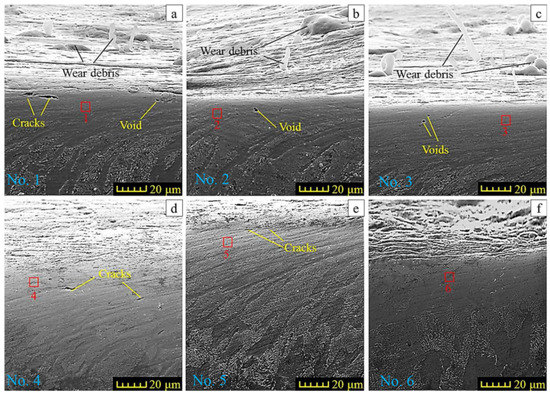 SEM graphs of plastic deformation under the worn surface: (a–f) present the plastic flow microstructures of No. 1–No. 6 specimens, the red rectangular area denotes the detection position of the EDS.