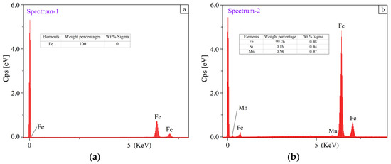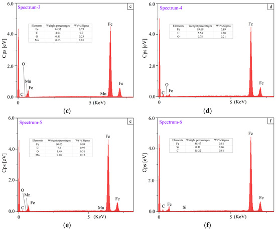 The peaks of ferrite (Fe), carbon (C), silicon (Si), manganese (Mn) and oxygen (O) in the fragmentation zones (marked in Figure 13) are shown together with the EDS spectra (Figure 14). It appears that the chemical compositions are different from each other. The largest weight percentage of Fe is 100%, which was detected in the marked area of specimen No. 1. No other elements were detected except the Fe element. The largest weight percentage of the C element was found in specimen No. 6 after the sliding test, as displayed in Figure 14f. It can be pointed out that a transition was generated in the sliding tests. The results also implied that little cementite was observed and the grains were refined in the fragmentation zone, which was explained with the mechanism of the ultrafine structure in the ductile material [13].