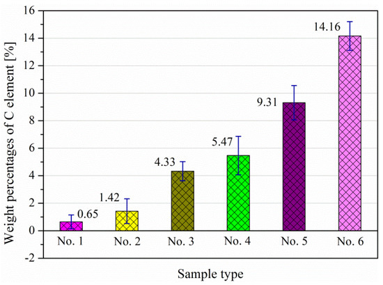 In order to study the C element in the subsurface, EDS measurements performed for the six specimens were derived from three different positions at the same depth of 10 μm under the worn surface. The mean values of the C element content under the worn surfaces are shown in Figure 15.