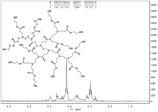 1H NMR and FT-IR analyses were first used to characterize the composition and structure of the HBP reactor. 1H-nuclear magnetic resonance spectroscopy (300 MHz, D2O, 298 K) (Figure 1). δ: 2.56 (m, br, OHCH2CH2OOCCH2CH2)2N–), 2.81~2.82 (m, br, (OHCH2CH2OOCCH2CH2)2NCH2CH2NCH2CH2COOCH2–), 3.459 (m, br, (OHCH2CH2OOCCH2CH2)2NCH2CH2NCH2CH2–COOCH2CH2OH), 3.276~3.309 (m, br, (OHCH2CH2OOCCH2–CH2)2NCH2CH2NCH2CH2COOCH2–), 3.034~3.028 (m, br, (OHCH2CH2OOCCH2CH2)2NCH2CH2NCH2CH2COOCH2CH2OH). There is no chemical shift of the hydroxyl group H in the structural formula. These chemical shifts were complex due to the complicated composition, many peaks overlap, so it is not easy to distinguish. Nevertheless, the structure of the product was judged by comparison with intermediate-2 of HBP. Thus, this HBP reactor was prepared in the desired form. Details of other architecture elucidation determinations can be found in the Appendix A.