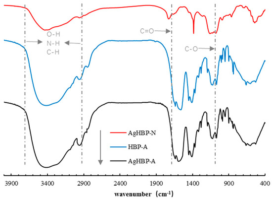 Figure 2 presents the FT-IR spectra of the prepared polymer reactors. They included the two control sample spectra. HBP-A exhibited almost the same spectrum as AgHBP-A, whereas that of AgHBP-N is different from the above. The same spectra between HBP-A and AgHBP-A can be ascribed to the comparable composition between HBP-A and the polymer carrier of AgHBP-A. The difference between AgHBP-A and AgHBP-N at 1000–1500 cm−1 may be ascribed to the presence of the hyperbranched polyethylenimine within AgHBP-N. In the spectrum of AgHBP-A, at 3000~3700 cm−1 belongs to the stretching vibration absorption of O–H/N–H, at ~1660 cm−1 was the stretching vibration absorption of C=O, at 1460 cm−1 and 1410 cm−1 was the in-plane bending and deformation vibration absorption of C–H, respectively. At 1150 cm−1 it belongs to the stretching vibration absorption of C–O in COO–, and ~1080 cm−1 belongs to the stretching vibration absorption of C–O in –CH2–OH. It is therefore clear that the prepared AgHBP-A was expected.