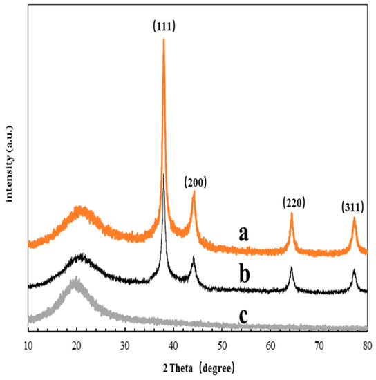XRD patterns of the prepared polymer reactors. (a) AgHBP-A; (b) HBP-A; (c) AgHBP-N.
