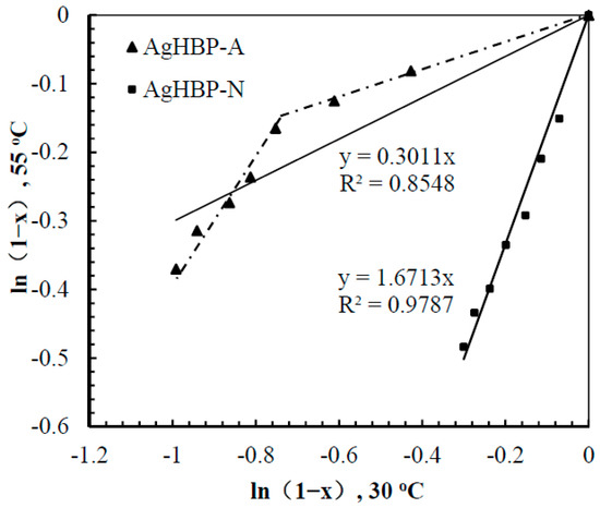 Here, x is the conversion of MB at time t; the subscripts ‘L’ and ‘H’ represent the relatively low and high temperatures, respectively; and Rr (≡kH/kL) is a constant that represents the relevant reactivity, which can be achieved by plotting the function of conversion. The catalytic relative activity of polymer catalysts at different temperatures is associated with the conversion. As shown in Figure 8, the linear correlative coefficient of the Rr values in the AgHBP-N system was as high as 0.9787, exhibiting good linear correlativity. This is due to the rise in temperature caused when the AgHBP-N system reactivity increases (67% increase). In contrast, the catalytic activity of AgHBP-A was significantly different from that of AgHBP-N. With the increase of temperature, the catalytic activity revealed a negative growth (and ran with bending). The catalytic activity of AgHBP-A was lower than that of 30 °C at 50 °C, that is, the catalytic activity decreased with the increase of temperature. This result strongly indicates that catalysis by the AgHBP-A is a tunable process, which is tunable with temperature. Kinetic fitting of the catalytic activities of the as-prepared reactor is further reflected in the temperature response and the self-switchable properties within AgHBP-A.