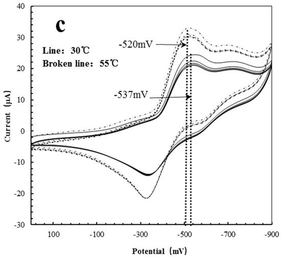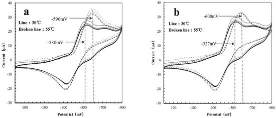 Given the responsiveness of AgHBP-A, 30 and 55 °C were again selected for a comparison. MB attached to AgHBP-A at 30 °C exhibited a desorption/reduction peak at −530 mV. In contrast, this peak shifted to a larger position (−596 mV) at 55 °C (cf. Figure 9a). As anticipated, the AgHBP-A demonstrated a stronger interaction with MB at 55 °C than at 30 °C. The self-switchable ability appears to play some role for the hydrophilic-hydrophobic interaction.