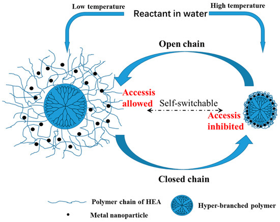 Unlike the linear intelligent polymer materials, hyperbranched polymer (HBP) substrate possesses advantages in performance such as low viscosity, good solubility, good weatherability, high reactivity, etc. [7,8,9]. Therefore, it is a rare substrate material for polymer reactors. Unfortunately, stimuli-responsive polymer reactors with such a hyperbranched structure still remain underdeveloped.
