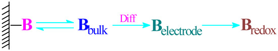 Electrochemical studies were further performed to ascertain the switchable catalytic behaviors of the prepared polymer catalysts. The underlying issue for polymer catalysts and their catalytic mechanisms lies in the interaction between the catalyst and the substrate. It is known that the oxidation or reduction potential of the bonded molecules depends on the bonding state. Stronger binding will need more energy to overcome the binding. The theory and details, as outlined in Scheme 2, have been widely described [20,21]. In detail, the substrate (B) in the electrochemical system involve the desorption, the diffusion to the electrode surface and electrochemical terminal reaction. In the event that the diffusion is eliminated with sonication, the binding constant (K) can be directly related to the change of the redox potential (E) (i.e., Δln K = αΔE). As such, the electrochemical studies were performed in accordance with the paradigm, as shown in Figure 9.
