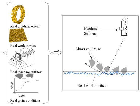 Therefore, compared to other real-life factors, (1) the loss/truncation/wear of abrasive grains; (2) the uneven size, height, and distribution of abrasive grains; and (3) the roughness of the already-ground workpiece surface are the main factors that govern the grinding mechanism (i.e., the microscopic interaction between the abrasive grains attached on the outermost circumference of a grinding wheel and workpiece surface).