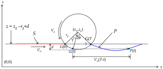 Figure 3 schematically illustrates the interaction between a point (an abrasive grain) attached on the outermost circumference of a grinding wheel and the workpiece surface. The mathematical description of this interaction is as follows. Let (,) be the coordinates of the center of the grinding wheel having a (nominal) radius and diameter dg (i.e., dg = 2rg) on the -plane. Let Vg be the surface velocity of the grinding wheel. Let be the rotational speed of the grinding wheel, i.e., . Let Vw be the workpiece surface velocity that acts in the x-direction. The case shown in Figure 3 corresponds to a cut called down-cut because Vw and Vg are in the same direction. The opposite case is called up-cut. Let d be the depth of cut of the grinding operation. Let S be the segment of workpiece surface that will be ground by the grain given by a point called G on the outermost circumference of the grinding wheel. This means that G gradually grinds S and lefts a trajectory P on the workpiece surface. This means that S becomes P due to the grinding action of G. As a result, the area confined by the trajectory P and a line z = zg − rg + d is the area from where the materials will be removed due to the action of the abrasive grain G. To be more specific, let G(t) be the position of the abrasive grain at time t. Let T be the contact period of the abrasive grain, i.e., t [0, T].