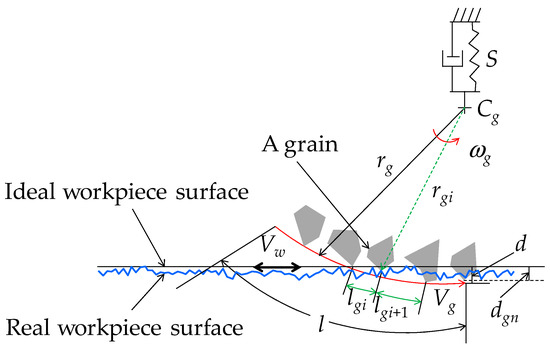 Regarding the variability in the depth of cut of an abrasive grain as schematically illustrated in Figure 5, the following considerations can be made. Let d be the expected depth of cut. An abrasive grain may not attain this depth of cut, as it might have been truncated, worn, or even lost during the grinding operation. Therefore, the distance between the outermost cutting point of an abrasive grain and the center of the grinding wheel (Cg), denoted as rgi, is most likely to be less than rg, i.e., rgi ≤ rg. Therefore, the actual depth of cut of an abrasive grain, denoted as dgi, is randomly distributed in the following interval: