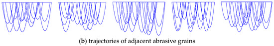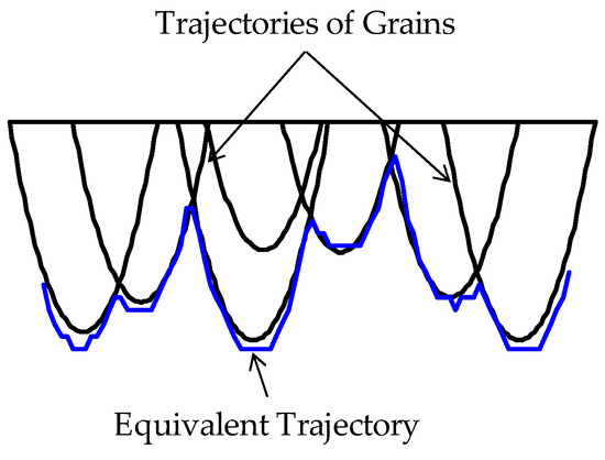 As such, if the equivalent trajectory condition is applied to the relevant segments of the trajectories given by Equations (7)–(10), then a trajectory called equivalent trajectory is created, as schematically illustrated in Figure 4. The concept of equivalent trajectory can be extended for multiple grains to determine the grinding effect on the workpiece surface.