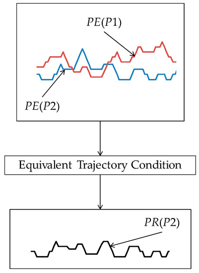 Note that in Equation (25), tj [0, Tgj] and tk [0, Tgk]. Figure 6 schematically illustrates the trajectories of a set of grains (seven grains as shown in Figure 6) and their combined effect, i.e., the equivalent trajectory. The equivalent trajectory is created by applying the equivalent trajectory condition (Equation (25)) to the trajectories defined in Equations (22)–(24). The equivalent trajectory is responsible for the surface roughness on the ground surface. If the grinding wheel passes the same area on the workpiece surface several times, the equivalent trajectory of a pass interacts with that of the previous pass. Let PE(P1) = (PEx(P1), PEz(P1)) be the equivalent trajectory of the first pass and PE(P2) = (PEz(P2), PEz(P2)) be the equivalent trajectory of the second pass. Here, PE(P1) and PE(P2) are determined using the formulation defined in Equations (22)–(25). The resultant trajectory PR(P2) generated after the second pass is created by applying the equivalent trajectory condition, as schematically illustrated in Figure 7.