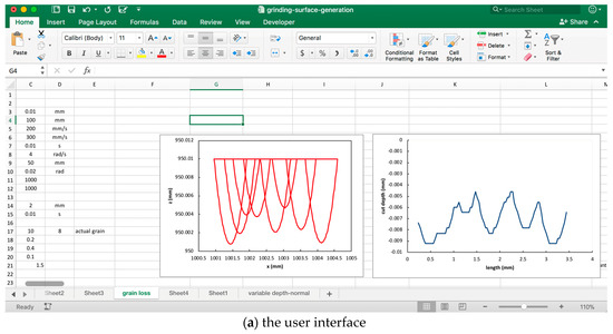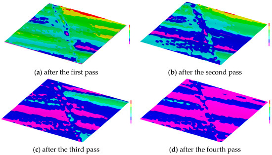 A computer-based system has been developed that runs based on the mathematical procedures defined in Equations (1)–(25) and creates the equivalent trajectory according to Equation (26) (Figure 6). The user interface of this system is shown in Figure 8. As seen from Figure 8, the system displays the trajectories of some grains and the equivalent trajectory for different passes. The system is capable of calculating the stochastic parameters (e.g., the radius of a grain, distance between two consecutive grains, and the number of grains) while determining the trajectories using Monte Carlo Simulation [34]. One can easily create the trajectories of the adjacent abrasive grains using the system, as shown in Figure 8b. The x- and z-coordinates of the equivalent trajectories calculated by the system can be used to create a theoretical grinding surface, i.e., the resultant trajectory after each pass denoted as PR(P1), PR(P2), … While setting the parameters (e.g., average number of grains) one can use the nominal data of grinding wheel parameters. The system shown in Figure 8 is used to study the effect of multiple passes on the ground surface topography. The equivalent trajectories of successive and adjacent abrasive grains can be used to simulate the surface topography of a ground surface. One of the sets of results is shown in Figure 9. The yellow, red, and light green areas are the shallow areas whereas the blue and purple areas are the deep areas. As seen from Figure 9, the deep areas gradually increase with the increase in the number of passes. This means that the more the number of passes, the more the materials removed from the workpiece surface. A somewhat similar trend is seen in the real-life case as shown in Figure 2, however.