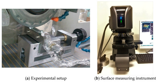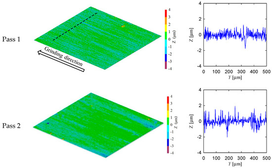 Figure 10 shows the experimental setup and surface measuring instrument used in this section. Referring to Figure 10, the grinding machine and surface measuring instrument are described in Table 1. The specifications of the grinding wheel, coolant, and workpiece are also shown in Table 1. The grinding conditions are also shown in Table 1. Figure 11 and Figure 12 show the surface topography of the ground surfaces measured by a laser microscope (Table 1 and Figure 10b). For each pass, the primary profile of the ground surface is also shown in Figure 11 and Figure 12.