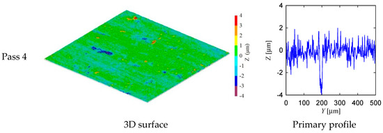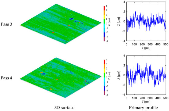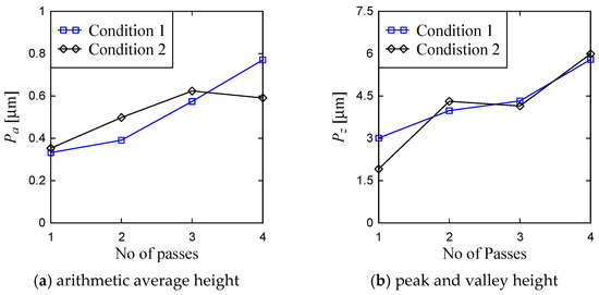 From the visual inspection of the surface topography and primary profile, it is clear that the complexity of the ground surface increases with the increase in the number of passes. For the sake of quantification, the primary profile data is processed in both conventional and non-conventional ways, as described in [35,36]. As a part of conventional way, the surface roughness parameters denoted as Pa (arithmetic average height) and Pz (peak and valley height) are calculated using the surface height data points as shown in Figure 11 and Figure 12. (Note that when the arithmetic average height and peak and valley height are determined from the roughness profile they are denoted as Ra and Rz, respectively.) The results are shown in Figure 13. In Figure 13, the Condition 1 means the feed rate is equal to 40 mm/s and Condition 2 means the feed rate is equal to 100 mm/s. The other cutting conditions are the same for both Conditions 1 and 2, as shown in Table 1. For both conditions, the trend remains the same, i.e., an increase in the number of passes increases the Pa and Pz. However, there is an exception. For Condition 2, Pa obtained after the third pass is greater than that of after the fourth pass. In addition, Pz remains almost the same for the second and third passes for Condition 2.