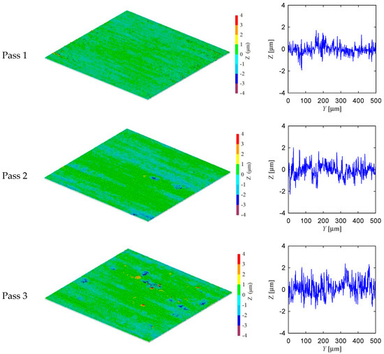 Now, while creating the topography shown in Figure 9, the center of the grinding wheel Cg = (xg,zg) is kept constant, i.e., the machine stiffness (denoted as S as shown in Figure 5) or vibration is not considered. In real-life grinding, vibration is an integrated part of grinding. Moreover, the alignment and form errors of the grinding wheel and workpiece surface are not considered while creating the while creating the topography shown in Figure 9. In real-life grinding, the alignment and form errors of the grinding wheel and workpiece surface are the integrated part of grinding. Therefore, the real-life workpiece surface topography may not perfectly resemble the ones shown in Figure 9. For this reason, the differences between theoretical and experiment surface topographies should be compared to see whether or not the overall trend (i.e., the amount of material removed increases with the increase in the number of passes) is violated. This issue is described in details in the next section using the experimental results.