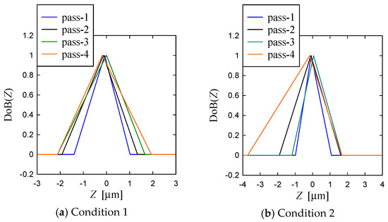 As a part of non-conventional quantification, the possibility distributions (probability distribution neutral representation of uncertainty) of the profile heights are also constructed, as shown in Figure 14, using the possibility distribution determination process described in Ullah and Shamsuzzaman [34] and Chowdhury et al. [37]. In Figure 14, the phrase “DoB” means the Degree of Belief. As seen from Figure 14, the primary profile heights about zero have very high possibility (DoB ≅ 1) whereas the possibility gradually decreases if the heights move away from the zero. For both conditions the possibility (or DoB) of variability in the surface heights increases with the increase in the number of passes. This means that the height distributions become more random due to the increase in the number of passes.