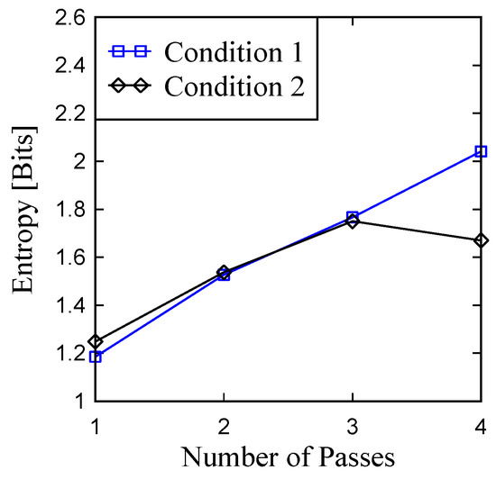 To be more specific, the entropy (or average information content) of the primary profile is determined using the procedure described in Ullah et al. [35]. The results are shown in Figure 15. For Condition 1, the entropy gradually increases from about 1.2 Bits to 2.0 Bits, whereas this trend is true from the other conditions except for the last pass where the entropy decreases compared to that of the previous pass. Since the more the entropy, the more the complexity, the ground surface tends to become more and more complex due to the addition of passes.