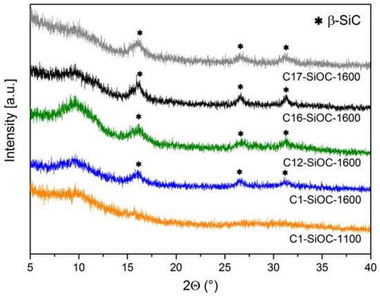 The XRD patterns of the samples investigated in this study are shown in Figure 1. Sample C1–SiOC–1100 was fully X-ray amorphous; whereas all of the other samples revealed the presence of broad reflections related to nanocrystalline β-SiC []. The broad hump centered at a 2θ value of approximately 9.5° is related to the presence of amorphous silica.