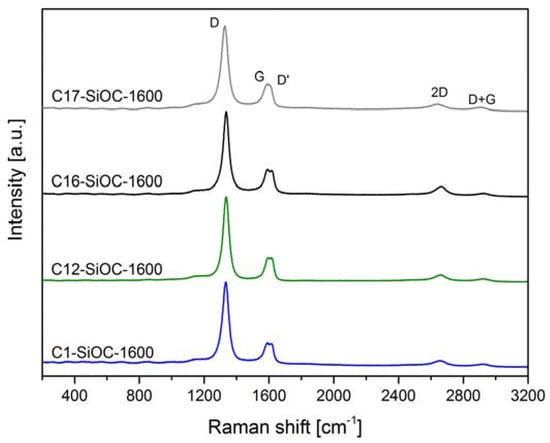 Besides C1–SiOC–1100, which is lacking any bands in the Raman spectrum (not shown), and is suffering from large fluorescence, all of the samples that were hot-pressed at 1600 °C showed rather similar Raman spectra, and revealed the typical features of a disordered sp2-hybridized segregated carbon phase, as shown in Figure 2.