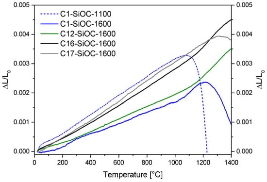 An additional parameter that can be determined from the thermal expansion curve is the dilatometric softening point corresponding to the maximum of the dilatometric curve, and to a viscosity of ca. 1010 Pa∙s. Among the SiOC glass ceramics studied, such a maximum is visible for samples C1–SiOC–1600 at 1220 °C, and for C17–SiOC–1600 at 1300 °C, which is again significantly lower than those derived from the shear viscosities. Similar to Tg, the dilatometric softening point was dependent on the applied pressure for fixing the samples inside the dilatometer []. With increasing pressure, the dilatometric softening point was shifted to lower temperatures. Moreover, the value determined for sample C17–SiOC–1600 was considered as being biased by a slight densification due the elimination of the residual porosity.