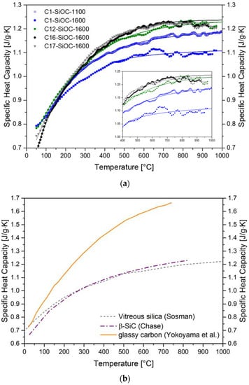 Temperature-dependent specific heat capacities of SiOC glasses and glass ceramics (a). Points represent the measured values; the solid lines represent eye guidelines. The inset details the specific heat capacities in the temperature range of 400 °C to 1000 °C. The values for glassy carbon [], vitreous silica [], and β-SiC [] are plotted for comparison (b).