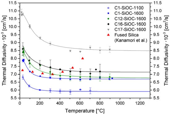Figure 5 summarizes the thermal diffusivity of the investigated SiOC glass and glass ceramics. The low carbon-containing SiOC glass ceramics revealed comparable values to fused silica []. The thermal diffusivity in SiOC increased as the amounts of segregated carbon increased. This observation matched the higher thermal diffusivity values for glassy carbon of 0.05 cm2/s to 0.044 cm2/s in the temperature range between 20–700 °C []. However, the amount of carbidic carbon (i.e., volume fraction of β-SiC) additionally seemed to have an important influence. This is expressed by the comparison of C16–SiOC–1600 and C17–SiOC–1600, as their amount of segregated carbon was comparable; however, their thermal diffusivities were significantly different. It is conceivable that the comparably high values of C17–SiOC–1600 were resulting from the higher amount of β-SiC (cf. Table 1), which showed significantly higher thermal diffusivity values of 0.809 cm2/s at room temperature [].
