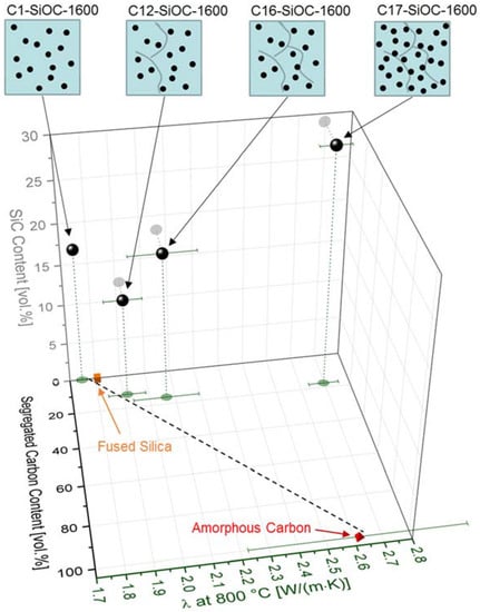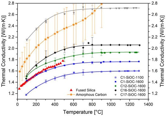 Among all of the studied samples, the glassy SiOC material (C1–SiOC–1100) showed the lowest thermal conductivity, whereas the phase-separated low carbon-containing SiOC glass ceramic sample (C1–SiOC–1600) showed values very similar to vitreous silica [] (Figure 6). As the content of segregated carbon increased in the SiOC glass ceramics, the thermal conductivity was observed to increase. This is probably due to the higher thermal conductivity value of the segregated carbon present in the materials. For instance, amorphous carbon [] exhibited values in the range of the high carbon-containing SiOC glass ceramics up to 800 °C (C16–SiOC–1600 and C17–SiOC–1600), and reached values of ca. 3.18 W/(m∙K) at 1000 °C. Interestingly, the thermal conductivity of C17–SiOC–1600 was significantly higher than that of C16–SiOC–1600, despite there being a comparable content of segregated carbon present in both samples (i.e., 16 vs. 17 vol %). The reason for this remarkable difference is considered to rely on the different content of the nanoscaled silicon carbide phase present in the mentioned samples. As crystalline β-SiC exhibited comparatively large thermal conductivities of 178.2 W/(m∙K) [], the increased volume fraction of silicon carbide in C17–SiOC–1600 may indeed be the reason for its higher thermal conductivity, as compared to C16–SiOC–1600.