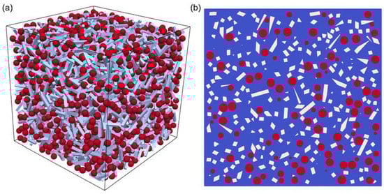 Modeled microstructure of sample C12–SiOC–1600: (a) three-dimensional representation of a 100 × 100 × 100 nm3 volume and (b) two-dimensional cross-section of (a). Red spheres represent β-SiC nanoparticles (5 nm diameter), and white rods represent the segregated carbon phase.