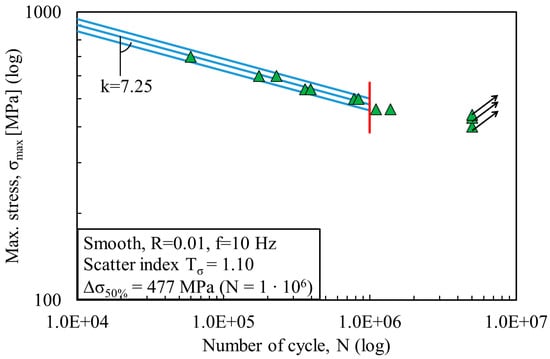 The fatigue data were statistically investigated using a log-normal distribution and are plotted here in a double log scale. All stress ranges refer to the net area. Figure 3 and Figure 4 show the fatigue data of the non-porous and porous specimens fabricated by LENS. Figure 5 shows the fatigue data of the wrought Ti-6Al-4V specimens. The same figures depict the mean Wöhler curve (probability of survival Ps = 50%) and the Haibach scatter band referred to 10% and 90% probability of survival (for confidence level equal to 95%), respectively. The run-out samples, over 1 million cycles, were not included in the statistical analysis and are marked with a horizontal arrow. A vertical line indicates the values corresponding to 1 million cycles. Values of inverse slope k and scatter index Tσ are also shown in Figure 3, Figure 4 and Figure 5. Table 3 presents the detailed fatigue properties of the tested samples.