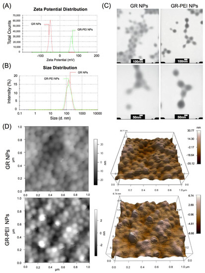Physical characteristics of GR NPs and GR-PEI NPs. (A,B) The particle size of GR NPs and GR-PEI NPs showed the similar size distribution, but the zeta potential of GR NPs and GR-PEI NPs was different in neutral condition. (C) TEM images of GR NPs and GR-PEI NPs showed the spherical morphology by the preparation protocol in this study (upper panel: scale bar = 100 nm; lower panel: scale bar = 50 nm). (D) AFM images demonstrated the uniform and spherical morphology after surface modification.