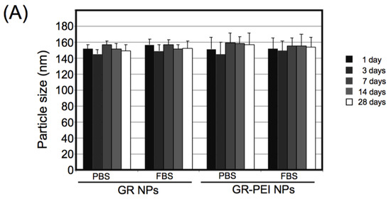 To determine the physical properties of GR NPs, the particle sizes and zeta potentials were measured under different temperatures, and pH values. As shown in Figure 2A, the particle size did not significantly change after incubation at 37 °C in the buffer for up to 28 days. GR NPs and GR-PEI NPs were heated from 50 to 100 °C and the particle size variation was determined after heating (Figure 2B). The results revealed no significant changes in the size distribution of both nanoparticles from 50 to 100 °C (Figure 2B). The results demonstrated that glutaraldehyde (GA) cross-linking strongly stabilized the gelatin nanoparticles.