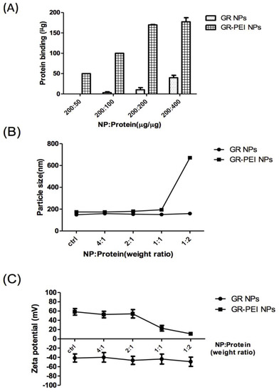 Bovine serum albumin (BSA) was used as a model protein in this study. BSA had negative charge under the neutral condition and was bound by GR NPs and GR-PEI NPs via electric adsorption. As shown in Figure 3A, GR-PEI NPs possessed more remarkable protein binding efficiency than GR NPs. The 100% binding efficiency was reached at weight ratios of both 200:50 and 200:100 (NP:protein). Moreover, we examined the particle size and zeta potential of each type of nanoparticle loaded with model protein to determine the effects of protein loading. The results showed that the particle size of GR-PEI NPs after protein loading was relatively stable, whereas that of GR-PEI NPs was increased when the NP/protein weight ratio was less than 1 (Figure 3B). The surface charge of GR NPs remained negative after BSA binding. The zeta potential of GR-PEI NP began decreasing when the NP/protein weight ratio was equal to or less than 1 (Figure 3C).