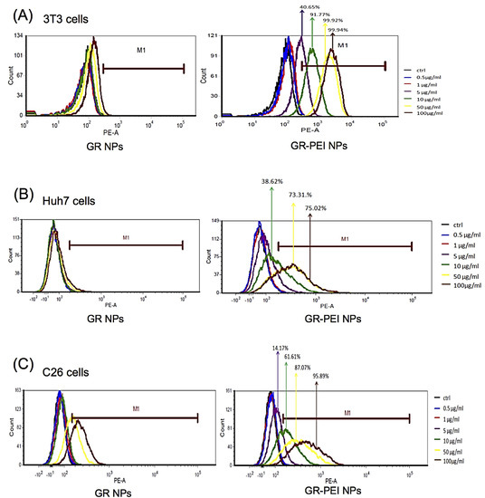 3T3 fibroblasts, human Huh7 hepatoma cells, and murine C26 colon adenocarcinoma cells were used to estimate the cellular uptake efficiency of RITC-labeled NPs. Cells with the RITC signals were quantified by flow cytometry. 91.77% of 3T3 cells acquired GR-PEI NPs when treated with 10 μg/mL of GR-PEI NPs (Figure 4A), 73.31% of Huh7 cells acquired GR-PEI NPs when treated with 50 μg/mL of GR-PEI NPs (Figure 4B), and 95.89% of C26 cells acquired GR-PEI NPs when treated with 100 μg/mL of GR-PEI NPs (Figure 4C).