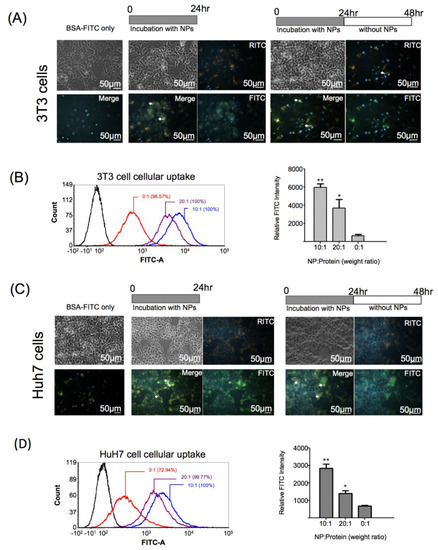 BSA-FITC-loaded GR-PEI NPs were used to determine the intracellular delivery efficiency of proteins in 3T3 and Huh7 cells. Cells were incubated with two formulations of BSA-FITC-loaded GR-PEI NPs (weight ratios of 10:1 and 20:1) at several time points. Incubation with free BSA-FITC was used as the control group to compare the intracellular delivery efficiency of proteins with or without carrier. After incubation for 24 h, considerable uptake of nanoparticles in both cell lines was observed (middle panel of Figure 5A,C). Compared to the control group, higher FITC intensity was observed in both cell lines treated with GR-PEI NPs of two different formulations (Figure 5B,D). As shown in Figure 5A,C, BSA molecules were released from GR-PEI NPs in the cells after 24 h of incubation. Additionally, more BSA protein was released from the particles in 3T3 and Huh7 cells after more 24-h culture (Right panel of Figure 5A,C), indicating the protein delivery capacity of GR-PEI NPs.