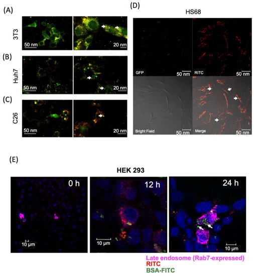 Intracellular protein release from GR-PEI NPs. Confocal laser microscopic images of intracellular protein release. The tomography of cells by confocal laser microscope demonstrated the intracellular BSA-FITC was released from GR-PEI NPs in 3T3 fibroblast cells (A), Huh7 hepatoma cells (B), C26 colon adenocarcinoma cells (C). GFP was released from HS68 fibroblast cells (D). Rab7 was used as late endosome tracker. The sub-cellular localization of BSA-FITC and GR-PEI NPs was observed in HEK293 cells that were transfected with late endosome marker, Rab7, (Bar: 10 μm) (E). GR-PEI NPs were shown as red signals; BSA-FITC and GFP were shown as green signals; Endosome marker Rab7 was shown as purple pink signals (Alexa Fluor 647, Thermo Fisher, Waltham, MA, USA). Co-localization of GR-PEI NPs and BSA-FITC was shown in yellow.
