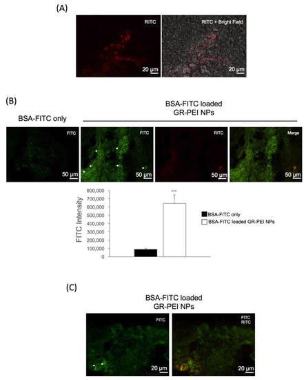 To determine whether GR-PEI NPs can accumulate in vivo, GR-PEI NPs were administered at the tumor site of C26 tumor-bearing mice for 72 h. As shown in Figure 7A, RITC signals were detected in the tumor tissue. The uptake and delivery of BSA-FITC by GR-PEI NPs was also observed in fluorescent images. Compared to the control group, the tissue sections administered BSA-FITC loaded GR-PEI NPs showed significantly more green fluorescence in the center of the tumor with spherical morphological signals (Figure 7B,C).