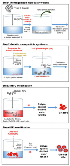 Gelatin nanoparticles were synthesized by two-step desolvation process. Briefly, gelatin type B (Gelatin Type B from bovine skin, about 225 bloom, 50–100 kD, Sigma, St. Louis, MO, USA) was dissolved in distilled water at 40 °C and modified the concentration to 5% (w/v). Under the condition of stirring at 600 rpm and 40 °C, the same volume of acetone (Seedchem Company, Melbourne, Australia) was added into gelatin solution. At this time, the solution changed to milky, and precipitation started to extract. Stopping stirring and placing the gelatin-acetone mixture for 5 min. Supernatant was removed and distilled water was added to re-dissolve the extracted gelatin at 40 °C. Here, 1 mL gelatin solution was taken into 15 mL tube and freeze drying to measure the concentration of gelatin solution. In the second step, gelatin nanoparticles were synthesized by adding drop-wise an excess of acetone into gelatin solution and cross-linked with glutaraldehyde (Wako, Japan). The concentration of gelatin solution was modified to 10 mg/mL and pH was adjusted to 2. The gelatin solution was heated to 40 °C and stirred with 1000 rpm on the hot plate. Then, acetone was drop-wise added into gelatin solution. When the volume ratio of gelatin versus acetone reached 1:3, GNPs may be extracted gradually. Glutaraldehyde was added, and the final concentration was 0.125%. Acetone was evaporated by stirring overnight. Then nanoparticles were harvested by centrifugation at 13,500 rpm for 30 min three times and re-dispersed in distilled water. Rhodamine B isothiocyanate (RITC) was conjugated in gelatin nanoparticles to generate GR-NP. Before conjugation, RITC was dissolved in Dimethyl sulfoxide (DMSO) and mixed with 1-ethyl-3-(3-dimethylaminopropyl) carbodiimide (EDC) (Sigma, St. Louis, Missouri, USA) on equal molar ratio. After 30 min interaction of carboxyl group of RITC with EDC, the suspension of GNPs was added into RITC solution which had been reacted with EDC (weight ratio of GNPs:RITC = 1000:1). After stirring for 4 h, the final suspension was then dialyzed against distilled water using a dialysis membrane (MWCO: 12–14 kDa, Spectrum Laboratories, Rancho Dominguez, CA, USA) for 24 h to remove the un-reacted molecules. GR-PEI NPs were generated by the conjugation of PEI to GR NPs. In briefly, at first, the pH value of GR NP suspension was adjusted to acidic condition. Then 1.8-kD PEI was added drop-wise into the GR NP suspension under stirring at 1000 rpm at room temperature and the pH value was adjusted under 5. Subsequently, EDC was added into the suspension to final concentration of 5 mM. After 4 h reaction, the conjugated nanoparticles were dialyzed against distilled water using a dialysis membrane for 24 h to remove the un-reacted molecules.