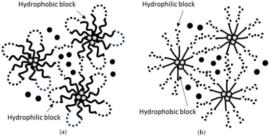 Nanogels are hydrogels formed by connecting nanoscopic micellar networks. Due to this unique structure consisting of micelles (hydrophobic core-hydrophilic exterior), nanogels are capable of incorporating hydrophilic compounds into the exterior of the micellar networks and hydrophobic compounds into the core of the micelles (Figure 1) []. Poly (D,L-lactide-co-glycolide)-block-poly(ethylene glycol)-block-poly(D,L-lactide-co-glycolide)(PLGA-b-PEG-b-PLGA; BAB block copolymer) nanogels (Figure 1a) have been widely used to locally deliver hydrophobic drugs at a slow elution rate [,]. Cho et al. successfully prepared a thermosensitive PLGA-b-PEG-b-PLGA nanogels which entrain three poorly water-soluble compounds, paclitaxel (a mitotic inhibitor), rapamycin (an mTOR inhibitor), and LS301 (cysteine-glycine-arginine-aspartic acid-serine-proline-cysteine-lysine-cypate, a cypate-based angiogenesis-targeting fluorescence imaging agent). The z-average diameters of PLGA-b-PEG-b-PLGA nanogels carrying three payloads were ca. 140 nm at 10 °C, ca. 140 nm and 450 nm (bimodal) at 25 °C, and ca. 800 nm at 37 °C. This result proved the presence of micelles at 10 °C and the association of micellar networks leading to a gelation at 37 °C. Three payloads were released from the nanogel matrix at an extended elution rate with the release half-lives of ca. 101 h, 102 h, and 97 h for paclitaxel, rapamycin, and LS301, respectively. PEG-b-poly(D,L-lactide) (PEG-b-PLA) micelles (a liquid formulation) loaded with three payloads showed much shorter release half-lives of ca. 18 h, 20 h, and 20 h for paclitaxel, rapamycin, and LS301, respectively. This report proved that a nanogel is capable of loading hydrophobic drugs in despite of the rich water content in the hydrogel matrix and considered to be a great local drug delivery system eluting hydrophobic payloads at the slower rate in comparison to a liquid micellar formulation. It has been reported that PLGA-b-PEG-b-PLGA nanogels termed Regel® were able to load various compounds including insulin, porcine growth hormone, recombinant hepatitis B surface antigen, paclitaxel, and cyclosporine A [].