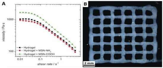 (A) Viscosity over shear rate for different systems. (B) Stereomicroscopic image showing a top view of a four-layer construct (obtained from []).