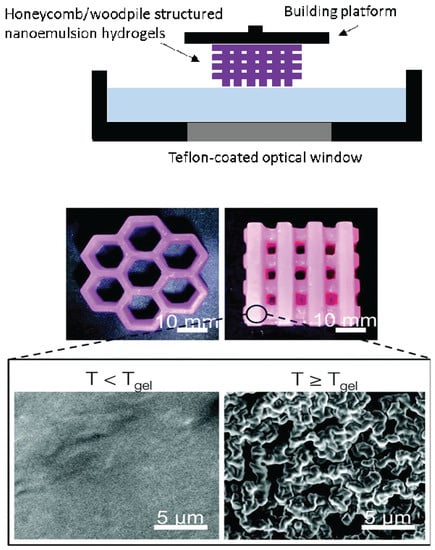 SLA 3D printing of honeycomb and woodpile structured hydrogels using thermoresponsive nanoemulsion inks (modified from []).