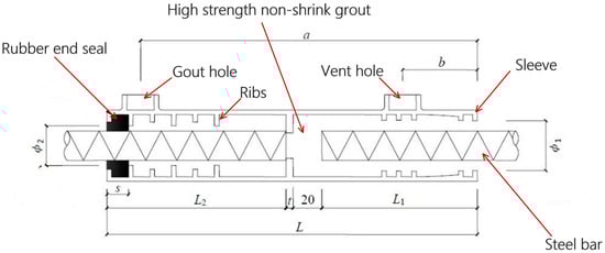 In previous engineering practices, the popular connections of reinforcing bars in precast elements are operated through lapped splices, welded splices and bolted connections [2]. Since the rigid grouted splices were invented [3], they have been used as the preferred technology to splice reinforcing steel bars particularly in precast concrete elements, due to its controllable tolerance, simple operation and no need for welding at the construction site. As a typical precast concrete mechanical connector system, the grouted splice sleeve (GSS) connection mainly has the advantages of bond-slip resistance of grout and mechanical gripping of reinforcement bars to facilitate the coupling of steel reinforcement bars and provide tensile and compressed resistance [4,5]. Figure 1 illustrates a typical GSS connector used in engineering. In this connector system, the reinforcement bars from precast elements are inserted into a hollow cylinder (sleeve) from both ends and then high-strength cement grout is filled into the sleeve at both sleeve ends as a load transferring medium and bonding material to splice reinforcement bars. Therefore, the application of GSS connector can significantly reduce the required rebar lap length and simultaneously maintains continuity of reinforcement between precast elements and structural integrity. Some studies have been conducted to investigate the mechanical performance of the GSS connector. For example, Arditi et al. investigated the factors affecting the use of precast concrete elements [6]. Zhao et al. analyzed the influence of elevated temperatures on the load carrying capacity of prestressed grout sleeve connections [7]. Ling et al. tested the tensile capacity of grouted splices connected by a welded bar sleeve and tapered head sleeve [8]. Lin and Wu studied the mechanical performance and the related stress-strain relationship for a GSS connection [9]. Apart from the widely used steel sleeves, the splicing techniques with fiber-reinforced polymer sleeve were also studied and the results revealed that splicing may be improved by introducing a composite sleeve [10]. Moreover, regarding seismic response of precast concrete structures connected by GSS joints, Belleri and Riva studied the suitability of grouted sleeve connections as column-to-foundation connections for precast concrete structures in seismic regions [11]. Popa et al. performed experimental testing on emulative GSS connections for precast columns in seismic region and concluded that the tested specimens have a similar hysteretic response and energy dissipation capacity to the reference ones for each level of applied axial force [12]. More recently, the seismic behavior of GSS connectors was analyzed respectively for precast concrete bridge columns [13] and shear walls [14].